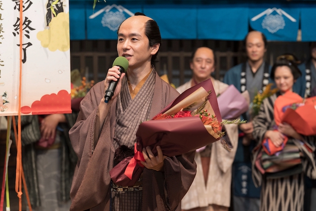 8月ごろですかね、流星くんが耕書堂の撮影のときに何にもない平らなところでつまずいているのを見まして、みんなよっぽど疲れてるんだなってつくづく思いました。それがおとといの撮影のときには、私の前をさっそうと歩く流星くんが。その姿を見てものすごくうれしかったのですが、同時にいよいよ終わるんだなとも感じてちょっと寂しくもありました。そして、(史実の)蔦屋重三郎と扇屋は6歳しか違わないということを知ったのは9月でした。今日のシーンはもう、棺おけに片足突っ込んでるようなじいさんで終わってしまいました(笑)。本当に皆さん約1年半お疲れさまでした。