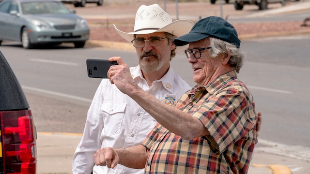 『エディントンへようこそ』は西部劇でもある。パンデミック禍におけるソーシャルディスタンスの距離は、そのままガンマン同士が対峙する決闘の間合いと重なる。銃はスマートフォンになり、戦いを見守る立会人は画面の向こう側にいる顔の見えない不特定多数だ。冒頭、暗闇の中で光るスマートフォンの画面を克明に捉えたダリウス・コンジの撮影を見れば、本作が「現代の西部劇」として、いかにスマートフォンという「銃」を真正面から撮ろうとしているかがわかる。
