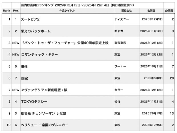 12月第3週の動員ランキングは、『ズートピア2』が週末3日間で動員116万1000人、興収16億2400万円をあげて2週連続でぶっちぎりの1位。前週との興収比は86%という、ロングヒット確実の異例の高推移。公開から10日間で早くも興収42億8300万円を記録していて、このまま正月興行においても間違いなく主役となるだろう。