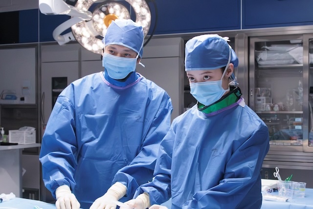 また場面写真では、中田啓介(向井理)を睨みつける田上湖音波(橋本環奈)や、新人看護師の鈴木颯良(宮世琉弥)、湖音波の父親の田上潮五郎(吉田鋼太郎)は湖音波の父親らの姿も捉えられている。