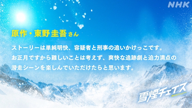 細田佳央太とムロツヨシがW主演を務める東野圭吾スペシャルドラマ『雪煙チェイス』が、NHK総合・BSP4Kにて2026年1月2日・3日の2夜連続で放送される。放送まで1週間を前に、原作者の東野圭吾からコメントが到着した。