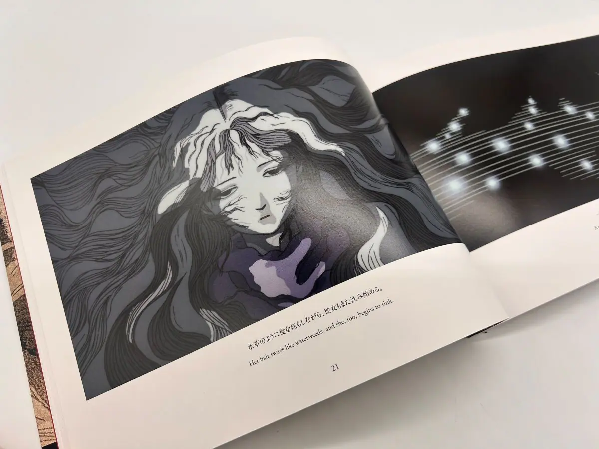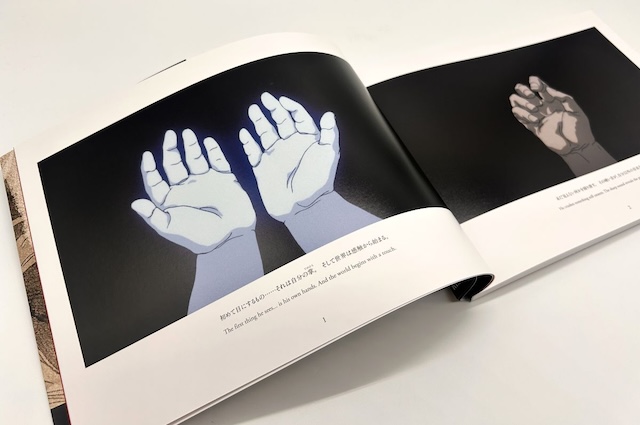 映画の場面を切り出し、押井監督によるエピグラフを添えてストーリーを見せていく本書。ファーストカットの青白い手に添えられた「初めて目にするもの……それは自分の掌(てのひら)。そして世界は感触から始まる。」というエピグラフと、押井監督自身による「人が生まれ、目覚めて最初に手を見ることで、アイデンティティーが生まれる」という言葉から、映画の中の誰かであり、また映画そのものが目覚めたのだと感じ取れるようになる。