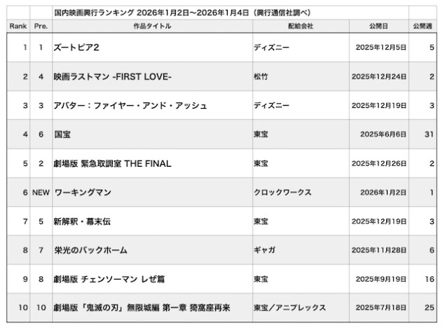 2026年最初の週末動員ランキングは、『ズートピア2』が1月2日から4日の3日間で動員76万6000人、興収10億5600万円をあげて、5週連続で1位。興収の前週比は91%と正月興行ならではの上乗せはなかったが、公開からちょうど1ヶ月、31日間の累計動員は784万5200人、累計興収は107億1900万円と、圧倒的な強さを見せている。昨年からの『劇場版「鬼滅の刃」無限城編 第一章 猗窩座再来』(公開から171日間の累計興収389億円)や『国宝』(公開から213日間の累計興収188億5900万円)の異次元興行のせいで麻痺しがちだが、今回の『スートピア2』の公開から30日間での興収100億円突破というのは、海外アニメーション作品としては『ザ・スーパーマリオブラザーズ・ムービー』(31日間)や『アナと雪の女王』(37日間)を更新する大記録。最終的には、歴代興収トップ10入り、つまり興収200億円前後の特大ヒットとなる可能性もでてきた。