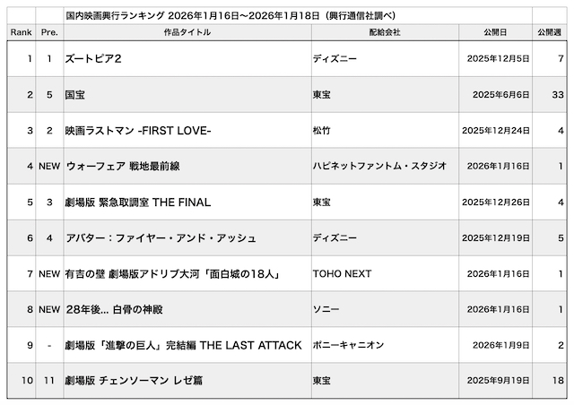 1月第3週の動員ランキングは、『ズートピア2』が週末3日間で動員34万5000人、興収4億8100万円をあげて7週連続1位。公開から45日間の累計動員は952万7800人、累計興収は129億8000万円。さすがに勢いは落ち着いてきたものの、まだまだ1位独走は続きそうだ。