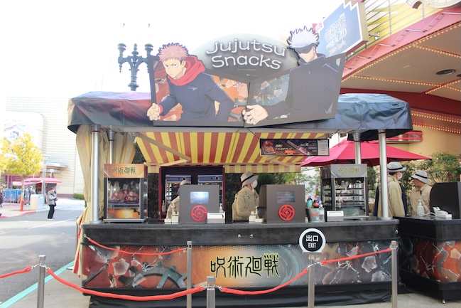 『呪術廻戦』コラボのフードは、「ザ・リアル 4-D」のシアター前にあるカートにて五条の虚式「茈(むらさき)」を表現したチュリトスや、「黒閃(こくせん)」を放つ虎杖をイメージした、“パンチの効いた”見た目と味のピザブレッドも登場。