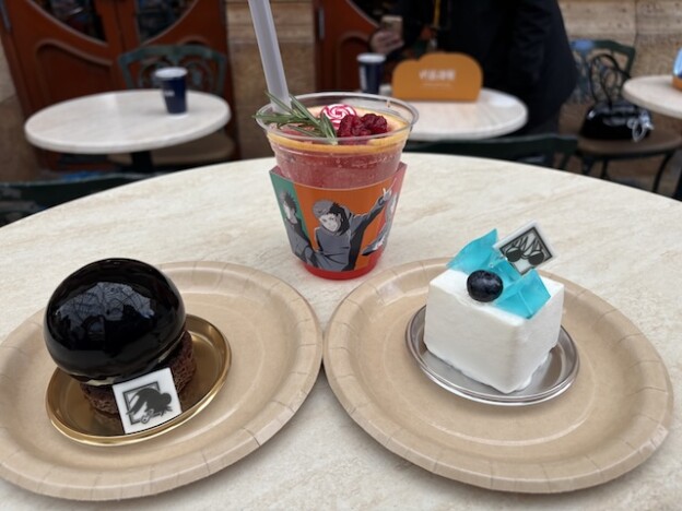 カートの向かいに位置するフレンチスタイルのカフェ『ビバリーヒルズ・ブランジェリー』では、呪術高専東京校1年生たちをイメージしたサンドウィッチプレートや、青春の爽やかさを感じるグレープフルーツ・レモネードが登場。レモネードには高専の制服ボタンのデザインがプリントされたマシュマロが乗っていて、映え要素も抜群。なにより甘いコラボフードが多い中でサッパリとした味わいが嬉しい。