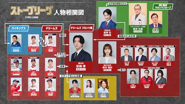また、桜崎が交渉を持ち掛けるライバル球団であるバイキングスのGM・石倉伸夫役として甲本雅裕の出演が決定。加えて、原作韓国ドラマ『ストーブリーグ』からハ・ドグォンのカメオ出演も実現した。そして、桜崎の抱える過去のカギを握る存在として、弟の明人をINIの木村柾哉、元妻の柳佐和子を矢田亜希子が演じる。さらに蒔田理紗の姉・美夕役には剛力彩芽が決定した。一方、球団ドリームズを傘下に持つオーナー企業の会長・根岸光雄役に吉田鋼太郎、会長の息子・根岸龍太役に安井順平がそれぞれ扮する。