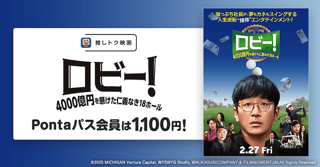 『ロビー! 4000億円を懸けた仁義なき18ホール』はPontaパス会員なら平日・土日祝日いつでも料金1,100円(税込)で鑑賞できる「推しトク映画」。