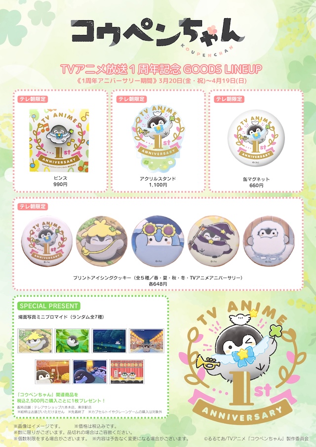 さらに、1周年記念ロゴをデザインしたテレビ朝日限定グッズの発売が決定。「ピンズ」をはじめ、「缶マグネット」「アクリルスタンド」が登場。加えて、コウペンちゃんと過ごした春夏秋冬の思い出を振り返る「プリントアイシングクッキー」も登場する。