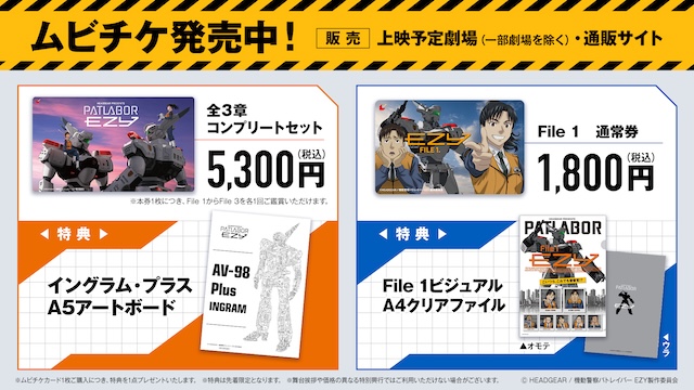 3月27日からは、上映予定劇場(一部劇場除く)と通販サイトにて本作のムビチケが発売決定。『File 1』から『File 3』までを各1回ずつ観ることができる「全3章コンプリートセット」は、野明と十和がそれぞれのイングラムとともに向かい合うファン必見のデザインに加え、設定画を使用したイングラム・プラスA5アートボードが特典となったプレミアムなセットになっている。File 1通常券には、十和と桔平のバディが描かれており、キービジュアルを使用したA4クリアファイルが特典として付属する。