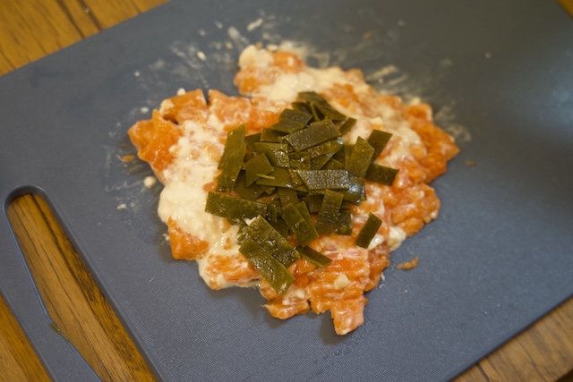 実際に食べてみると、まず印象に残るのは、サーモンも白子もそれぞれの素材の味がしっかり立っていることだ。今回使っている調味料らしい調味料はほぼ塩だけなので、素材そのものの風味がよりまっすぐに出ているのだと思う。生ものらしい風味はしっかりあるが、昆布の旨みと塩気が全体をきゅっと引き締めてくれるので、味わいはきれいにまとまっている。おかずとして食べてもいいし、少量ずつつまむ酒肴としてもかなり優秀な一品だ。