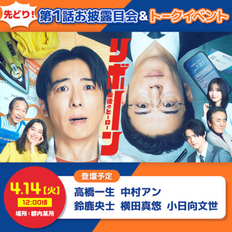 また、放送に先がけて『先どり!第1話お披露目会&トークイベント』が4月14日に開催されることも決定。最速で本編を鑑賞できる貴重な機会に加え、主演の高橋をはじめとする主要キャスト陣が登壇し、舞台挨拶も行われる予定だ。本日3月31日より参加者応募がスタートする。応募方法などの詳細は公式サイトにて。