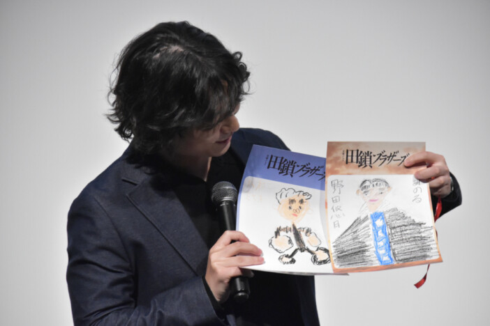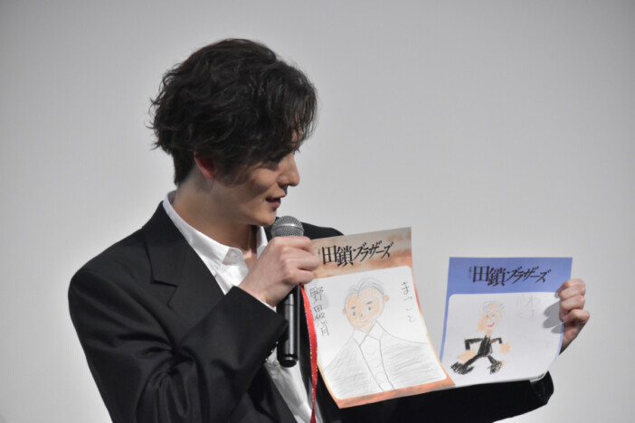 野田と金子は、岡田と染谷に“大人になった田鎖ブラザーズ”の似顔絵もプレゼント。岡田は「感動しちゃった。すごくうれしい」と感激した様子で、染谷も「うれしいです。飾らせていただきます」と顔をほころばせた。