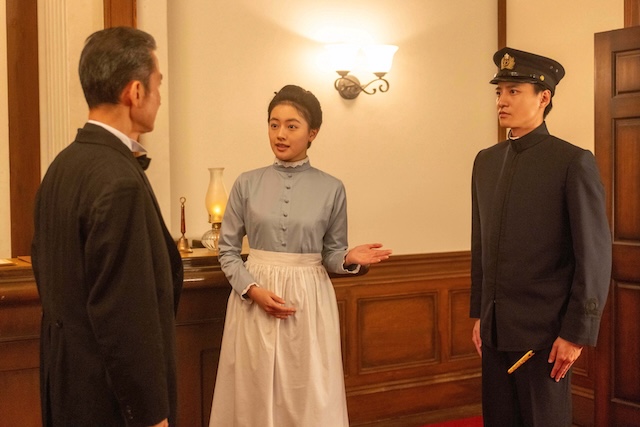 捨松の誘いを断った直美は、鹿鳴館の入口で、小日向(藤原季節)が通行証をなくして立ち往生しているのを目にする。直美の機転で小日向は入館できたが、筆者の中で疑念が生じた。よもや小日向も身分を偽っているのでは? 上司の用事で入館証を忘れることは考えにくい。いつも詰襟の制服姿で、館内で他の来賓と歓談する姿も見られなかった。直美は、自分と同じような相手を見つけただけではないのか。