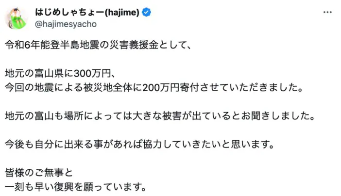 富山県出身の人気YouTuberはじめしゃちょーが、地元及び被災地への支援として、総額500万円の寄付を行ったことを公表した。
