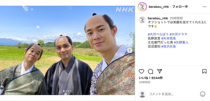 NHK大河ドラマ『べらぼう〜蔦重栄華乃夢噺〜』の公式Instagramが更新され、嶋田久作、井上祐貴、中村隼人による“饅頭オフシ…
