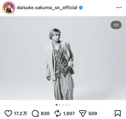 Snow Manの佐久間大介が自身のInstagramに散歩帰りのプライベートショットを投稿し、おしゃれな私服姿が話題になってい…