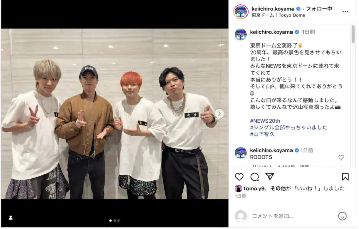NEWS、元メンバーの山下智久含むレアなグループショット 小山慶一郎が喜びの思い綴る