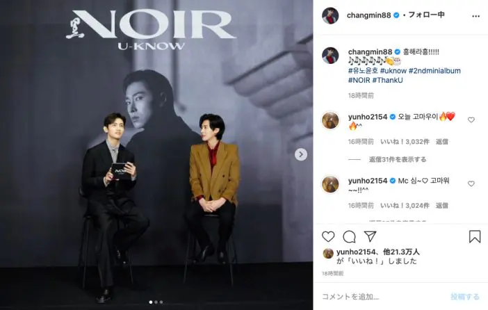 1月18日、東方神起のチャンミンが自身の公式Instagramを更新。ユンホがソロとして発売した2ndミニアルバム『NOIR』を…