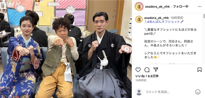 NHK連続テレビ小説『あんぱん』公式Instagramより、河合優実、阿部サダヲ、中島歩の“不適切にもほどがある!”3ショットが…
