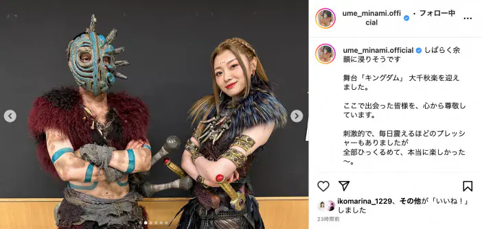梅澤美波、舞台『キングダム』千秋楽で出演者との写真多数アップ バジオウ役 元木聖也とのインパクト強いツーショットも