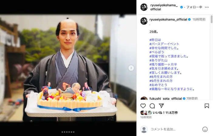 横浜流星、29歳の誕生日を『べらぼう』チームも祝福 福士蒼汰も「うわお! おめでとう」