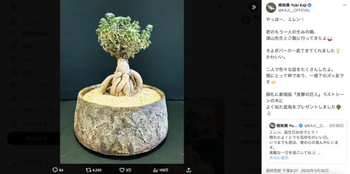 梶裕貴がX(旧Twitter)を更新し、『進撃の巨人』原作者・諫山創とのツーショットを公開。梶が声を務めたキャラクター、エレン・…