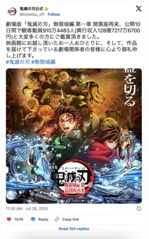 現在公開中の映画『鬼滅の刃 無限城編 第一章 猗窩座再来』。公開一ヶ月で興行収入は257億円を突破し、現時点で国内歴代興収4位と…