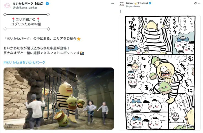 Web漫画 2025.06.19 16:44 「ちいかわパーク」の見どころは? 「ゴブリンたちの牢屋」に「ミートボールころがし」……原作漫画から予想 人気漫画『ちいかわ』の世界を楽しめる体験型施設「ちいかわパーク」。発表当初は“大型体験型施設”という名の元、その内容は明かされて… 加藤かづき ちいかわナガノ加藤かづきちいかわパーク
