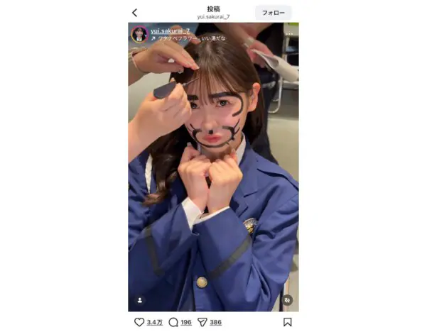 FRUITS ZIPPERの櫻井優衣が1月8日、自身のInstagramを更新。極太眉毛にひげメイク姿のオフショットを公開してい…