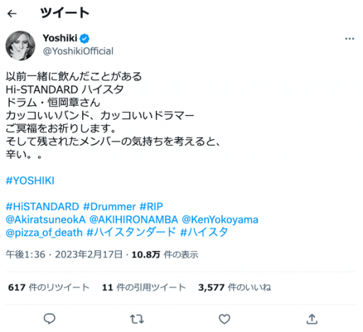 Hi-STANDARD 恒岡章の突然の死にYOSHIKIらから悲しみの声 「残されたメンバーの気持ちを考えると、辛い」