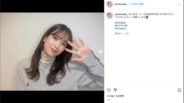 日向坂46の佐々木久美が、3月27日にInstagramアカウントを開設し初めての投稿を行った。 アカウント名は「kumis…