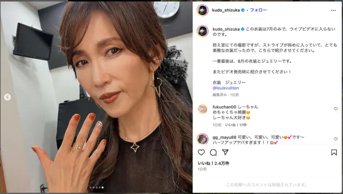 工藤静香が、LOUIS VUITTON(ルイヴィトン)のドレスとジュエリーを纏ったライブ衣装を自身のInstagramに公開した…