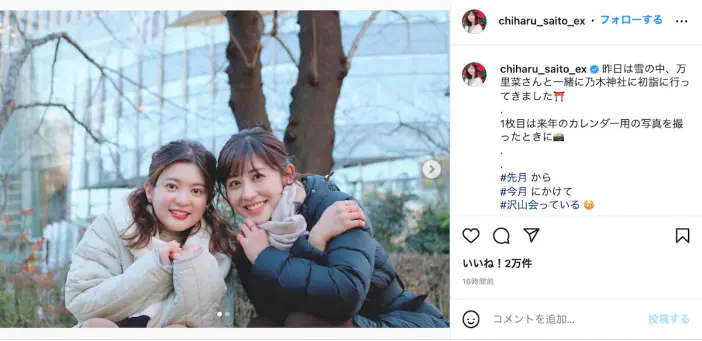 テレビ朝日の斎藤ちはるアナウンサーが、並木万里菜アナウンサーと一緒に乃木神社へ初詣に出かけたことを2人が自身のInstagram…