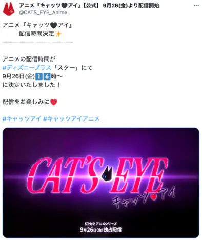 アニメ 2024.11.21 11:27 『キャッツ・アイ』完全新作アニメ、ディズニープラスで2025年配信 Adoがテーマ曲を歌唱 北条司の漫画『キャッツ・アイ』の完全新作アニメがディズニープラス「スター」で2025年に独占配信されることが決定した。 これ… リアルサウンド映画部 アニメ北条司ディズニープラスAdoキャッツ・アイ