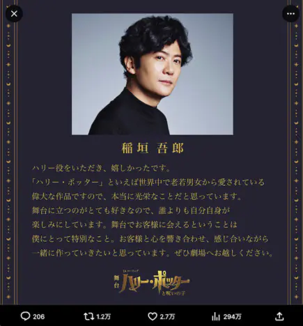 TBS赤坂ACTシアターにてロングラン上演中の舞台『ハリー・ポッターと呪いの子』に、稲垣が7月よりハリー・ポッター役を務めること…