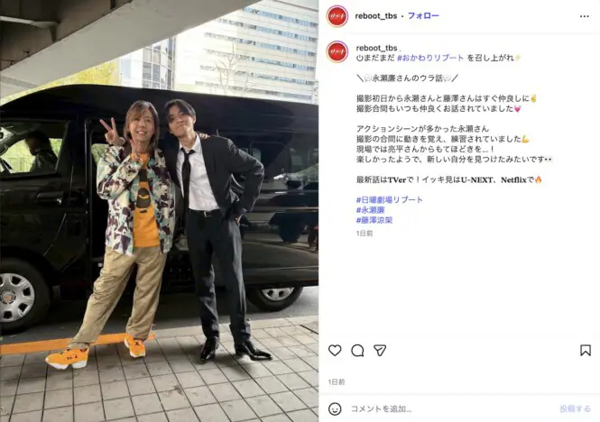 日曜劇場『リブート』(TBS系)の公式Instagramが更新され、冬橋航役の永瀬廉と霧矢直斗役の藤澤涼架のツーショットが投稿さ…
