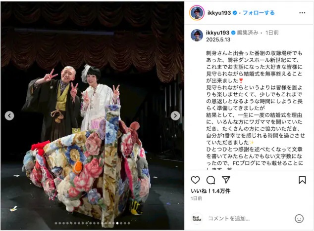 ニュース 2025.05.22 18:00 吉岡里帆も祝福「可愛いです」 人気ボーカリスト&芸人の結婚式に小籔千豊、ニューヨーク 嶋佐和也ら豪華ゲスト続々 tricot、ジェニーハイの中嶋イッキュウが5月21日、自身のInstagramを更新。13日に行われたお笑いコンビ そいつどい… 本 手 本 手アーティスト速報バンド・ROCK中島イッキュウ