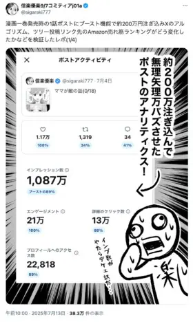 漫画 2025.08.05 16:21 『到達のアクタ』漫画家・信楽優楽、約200万円をかけたXブースト検証の全貌 個人クリエイターはどこまで自力で販促できる? Xのブースト機能に約200万円を投入し、1巻発売に合わせて前代未聞のプロモーションを実施した漫画家・信楽優楽。ヤンマガWeb連載… 間瀬佑一 漫画間瀬佑一信楽優楽