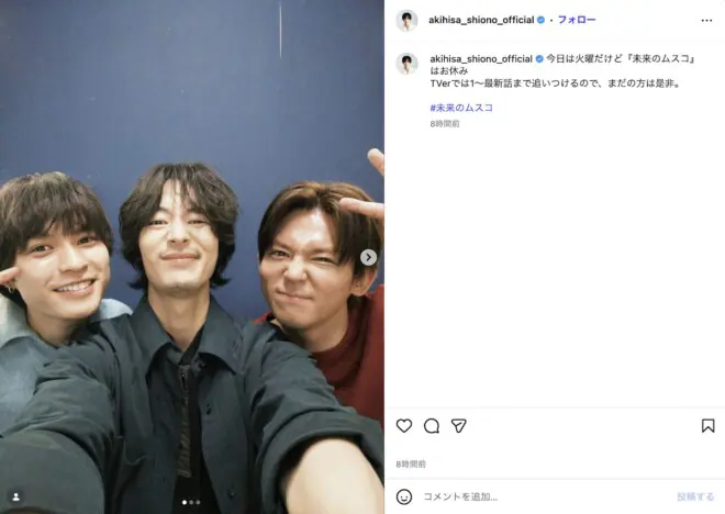 俳優の塩野瑛久がInstagramを更新し、火曜ドラマ『未来のムスコ』(TBS系)で共演中の小瀧望と兵頭功海との3ショットを公開…