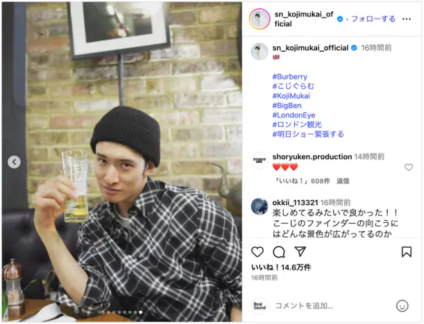 Snow Man 向井康二が自身のInstagramを更新。ロンドンを観光するオフショットを投稿している。 向井は昨年に引…