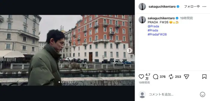 俳優の坂口健太郎がInstagramを更新し、「PRADA FW26」に関する写真を公開した。 坂口は「PRADA FW26…