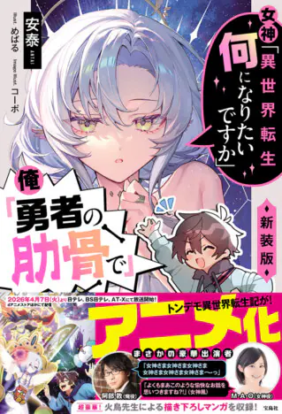 ニュース 2026.03.31 13:30 『女神「異世界転生何になりたいですか」 俺「勇者の肋骨で」』 アニメ放送記念で新装版刊行 『女神「異世界転生何になりたいですか」 俺「勇者の肋骨で」 新装版』発売。第8回ネット小説大賞を受賞し、2021年に書籍化した作… リアルサウンドブック編集部 宝島社安泰