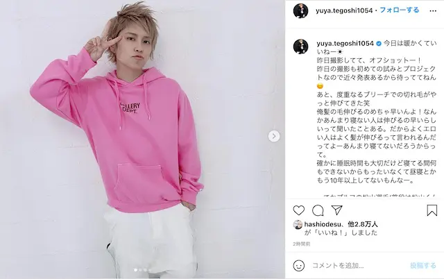 手越祐也が、4月12日に自身のInstagramを更新した。 手越はピンクのパーカー、南国をイメージしたTシャツやシャツ…