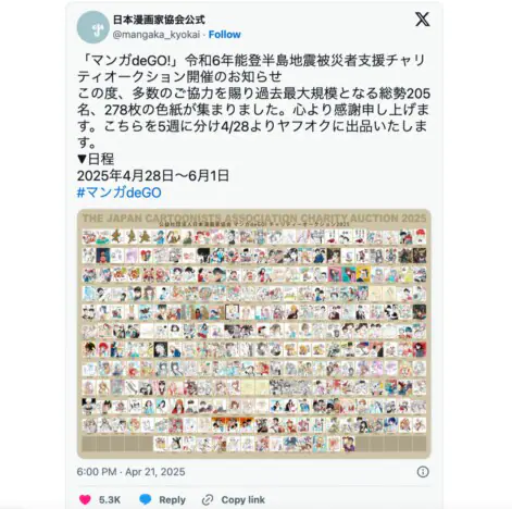 日本漫画家協会が、令和6年に発生した能登半島地震の被災地支援を目的としたチャリティオークションの準備を進めている。同協会の公式X…