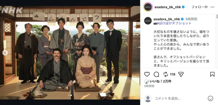 NHK連続テレビ小説『ばけばけ』の公式Instagramが更新され、キャストの集合オフショットが公開された。 1月9日放送の…