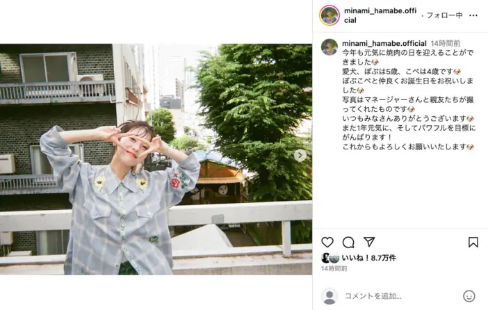 俳優の浜辺美波がInstagramを更新し、25歳の誕生日にあわせたオフショットを公開した。 投稿では「今年も元気に焼肉の日…