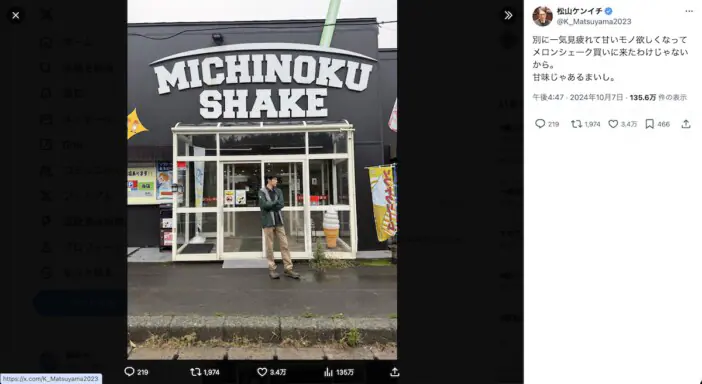 NHK連続テレビ小説『虎に翼』の“一気見”に挑戦中の松山ケンイチが、10月7日にシェイク専門店を訪れた写真を公式X(旧Twitt…