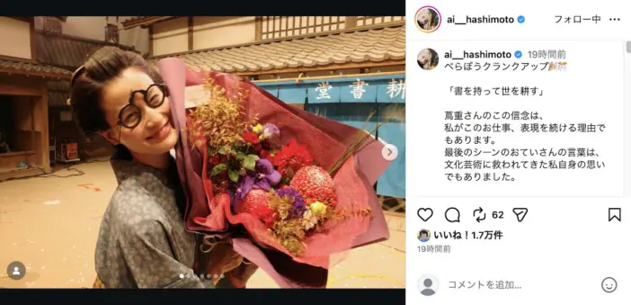NHK大河ドラマ『べらぼう〜蔦重栄華乃夢噺〜』の公式Instagramが更新され、橋本愛演じる“おていさん”の収録合間の姿が公開…