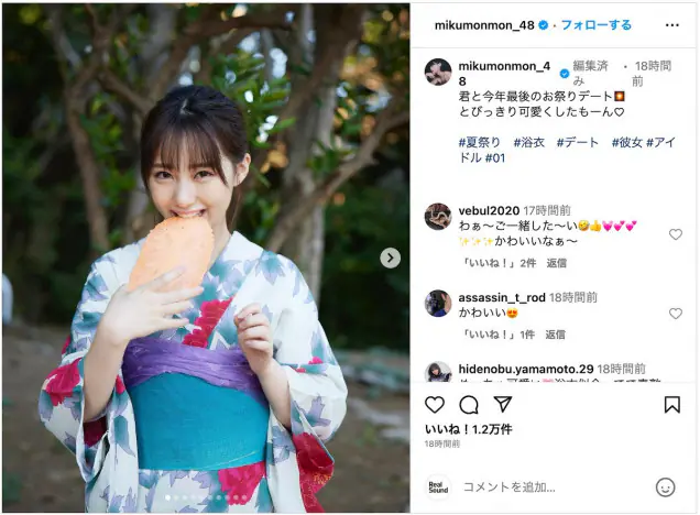 HKT48の田中美久がInstagramにオフショットを投稿した。写真は浴衣姿で夏祭りデートを演出するもので、線香花火や金平糖、…